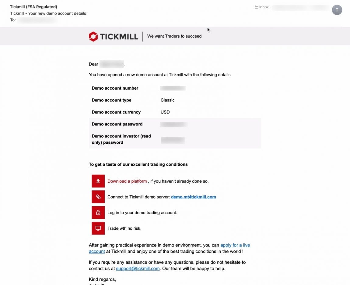 A continuación recibirás un email de confirmación con la información que necesitarás para descargar la plataforma de Metatrader 4, conectarla con el servidor Tickmill demo e ingresar en tu nueva y flamante cuenta demo.