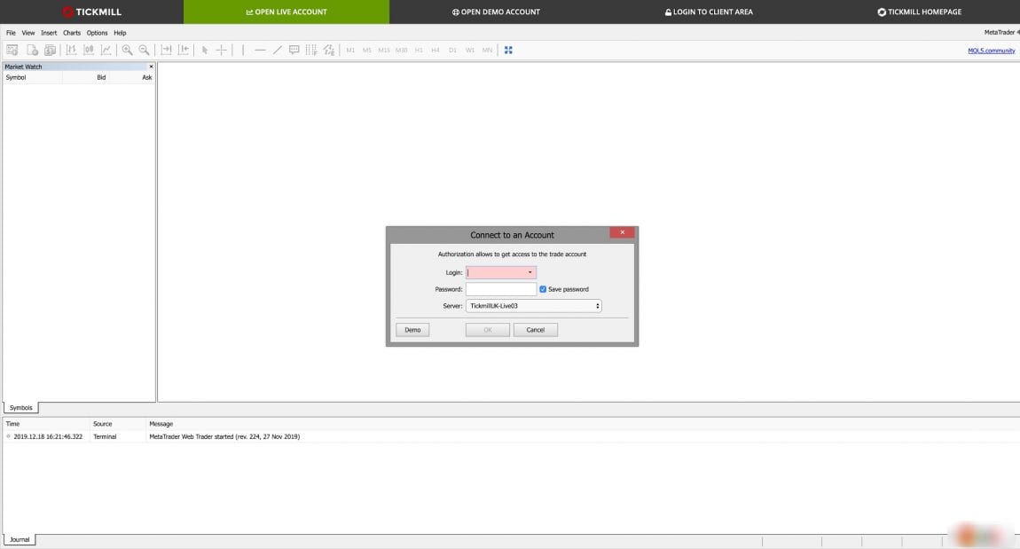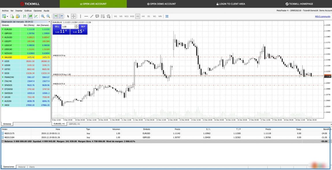 Por último, en la parte superior de la plataforma podrás encontrar puntos de utilidad de Tickmill que permiten acceder para crear otra cuenta demo, abrir una Tickmill live, ir a la zona de usuarios o a la página del broker.