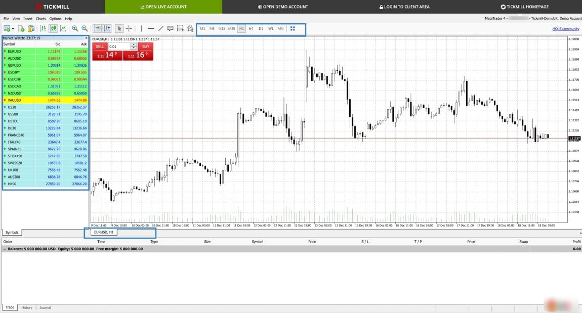 La plataforma MT4 de Tickmill tiene una consola central donde sitúa el gráfico del par que estás siguiendo en ese momento. Arriba del gráfico, podrás elegir la temporalidad las velas, que van desde un minuto hasta un mes.