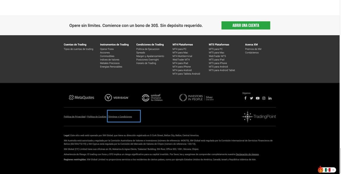 Entra a la página de XM México, dirígete hasta el fondo de la pantalla y sigue bajando. Una vez hayas encontrado el fondo máximo, verás que hay un enlace justo arriba de la información de la empresa. Encontrarás tres enlaces con documentos críticos de funcionamiento de la empresa. Clica en el que dice Términos y Condiciones.