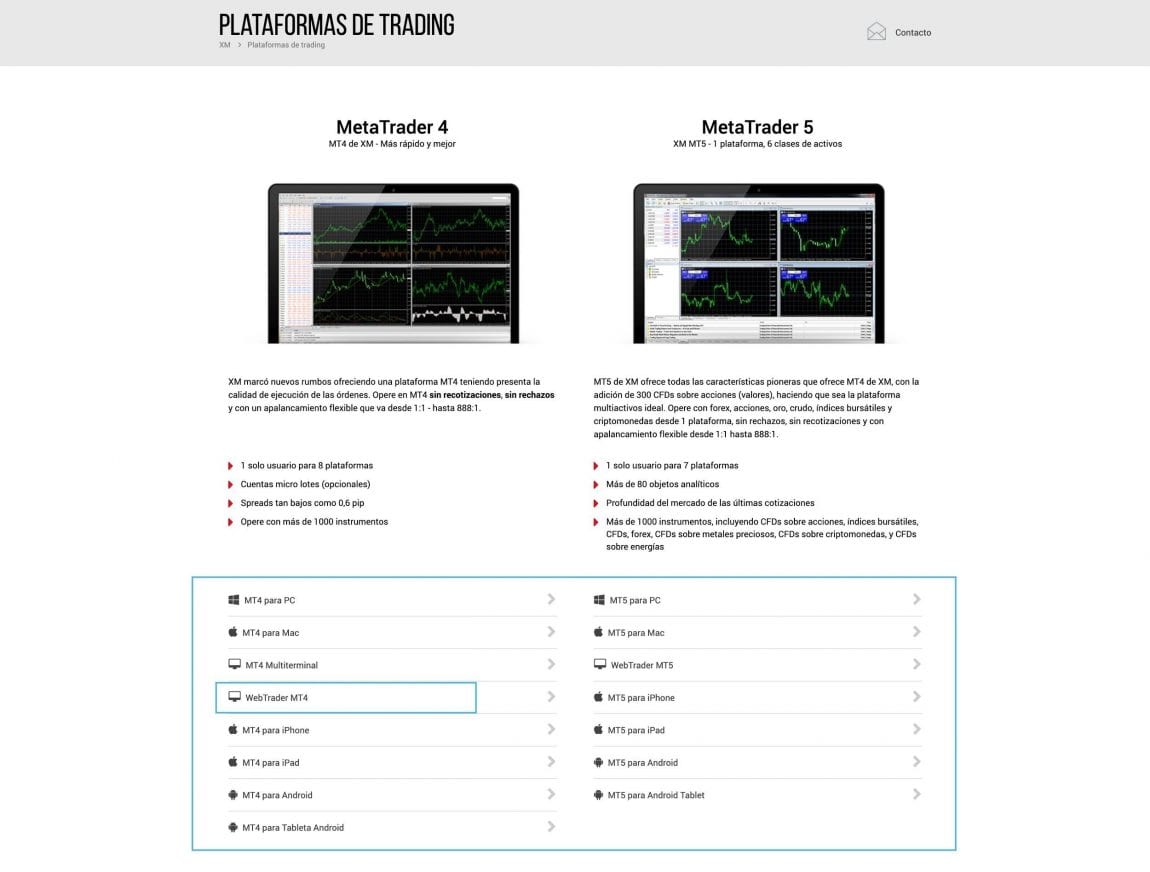 Para comenzar a utilizar su cuenta demo, vaya a la página de Plataformas de XM y elija la que desee. Puede descargarse MT4 o MT5 para PC o para MAC, también la plataforma MultiTerminal o el WebTrader.