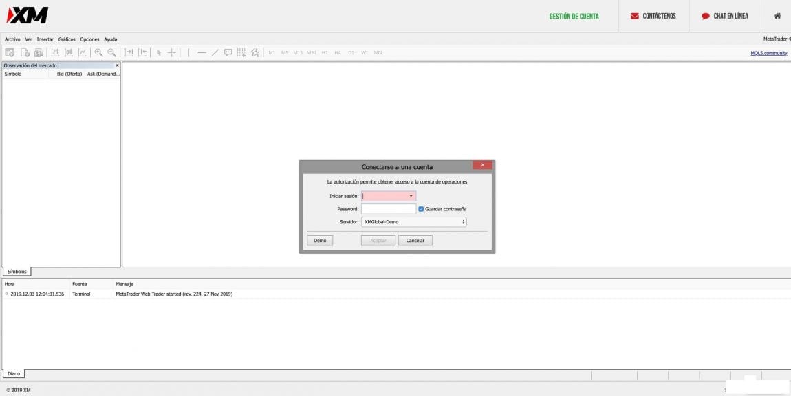 Paso 2: Una vez se te haya abierto el WebTrader de MT4, añada el ID y el password. Después elija el servidor, se recomienda seguir la información dada por XM en los emails. Por último presione el botón Aceptar.