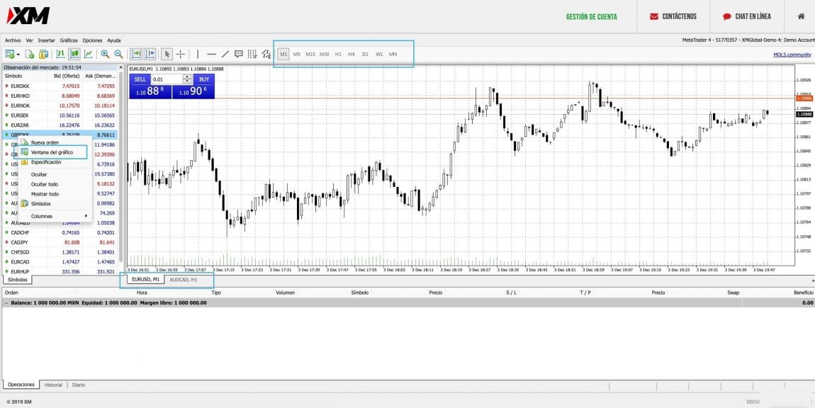 La plataforma MT4 de XM ofrece una consola central donde ubica el gráfico del par que está siguiendo en ese momento. Arriba de esa consola, podrá elegir la temporalidad del gráfico, que va desde un minuto hasta un mes por vela.