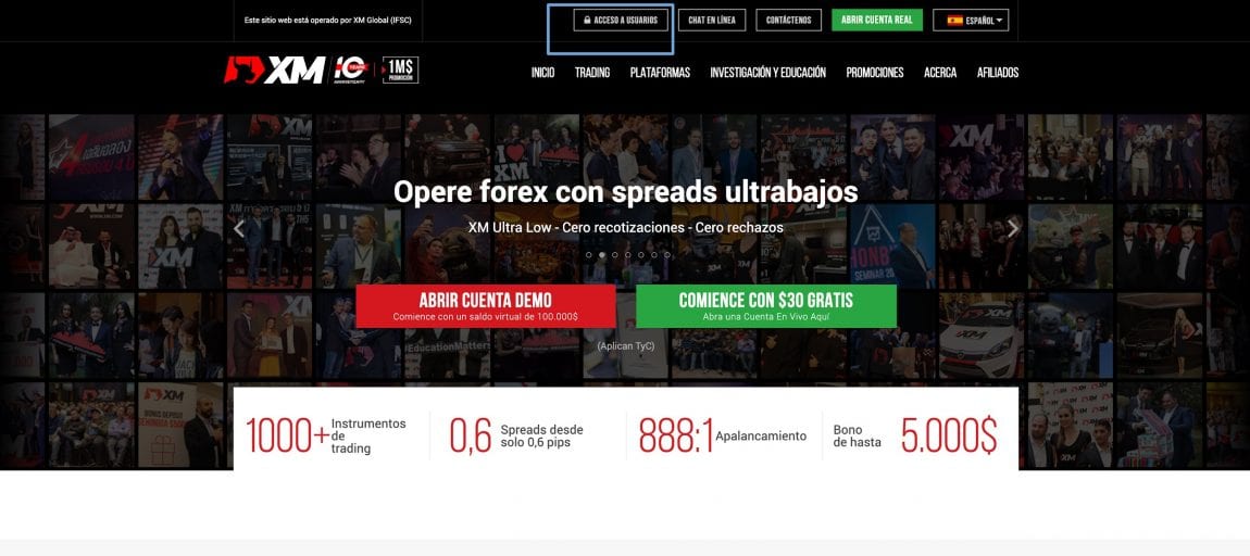 Paso 2: Después de haber completado el proceso de registro y validación de tu cuenta real, puedes clicar en el botón de acceso de usuarios en la parte superior de web de XM.
