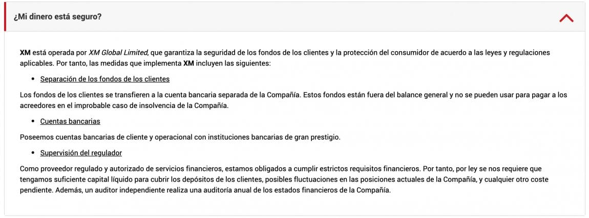 XM implementa medidas para asegurar el dinero de sus usuarios tales como lo son la separación de los fondos de los clientes de las cuentas de la empresa. Todos los fondos de los usuarios se transfieren a una cuenta bancaria separada de la Compañía.