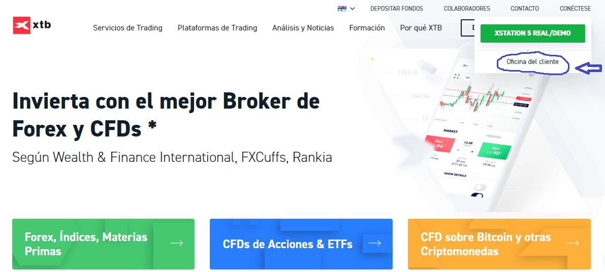 La acción siguiente para la realización de depósitos en XTB, luego de la creación exitosa de la cuenta real, se inicia dirigiéndose a la sección de la “Oficina del cliente”, donde se puede realizar toda la gestión de las cuentas XTB. Allí se procede a seleccionar la opción de depósitos.