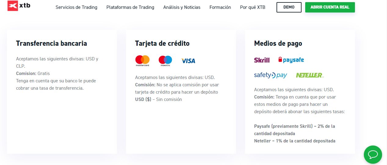 Las transferencias bancarias son el método por excelencia en XTB. Al momento de ingresar al sitio y seleccionar la opción de transferencia bancaria, se le suministrarán los datos para la ejecución de la transacción, sin embargo XTB no realiza cobro de comisión por emplear este método de pago.