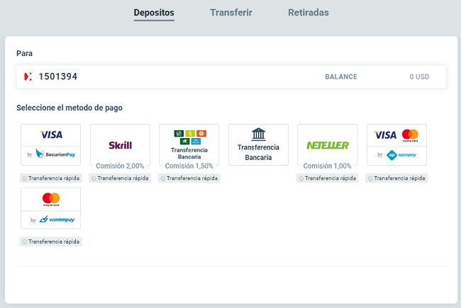 La respectiva ventana de depósitos le ofrece al cliente múltiples opciones para ejecutar sus transacciones, ente ellos están las tarjetas de crédito y débito, medios electrónicos como PayPal, Neteller, Skrill, Safetypay o Paysafe, y las transferencias bancarias.
