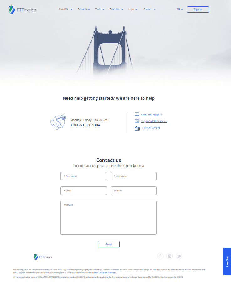 ETFinance les da a sus clientes tres opciones estándares para contactarlos por su sitio web. Puede encontrar información general y recibir soporte técnico cuando tenga un problema. Estas opciones incluyen un número telefónico gratuito de lunes a viernes de 7:00 horas a 19:00 horas GMT, una dirección de correo electrónico y una opción de chat de asistencia al cliente en vivo o “chat en vivo”. Puede recibir soporte técnico en inglés y en español.