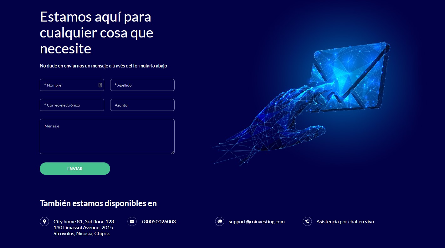 Hay tres maneras principales de contactar a ROinvesting: por un número gratuito, correo electrónico y por su chat en vivo. Un icono con dos globos de diálogo para acceder el chat en vivo se encuentra en todas las páginas del sitio web.