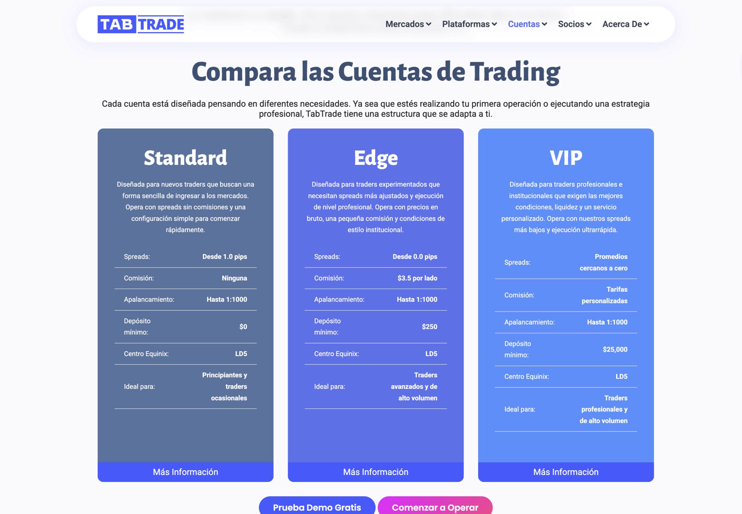 TabTrade ofrece tres tipos de cuentas reales diseñadas en función de perfiles de operador claramente definidos, además de una cuenta demo para quienes deseen explorar la plataforma y comprobar la calidad de la ejecución antes de invertir capital real. Todas las cuentas operan en la misma infraestructura Equinix LD5, lo que significa que la calidad de la ejecución es constante en todos los niveles; lo que varía es el modelo de precios y el capital mínimo requerido.