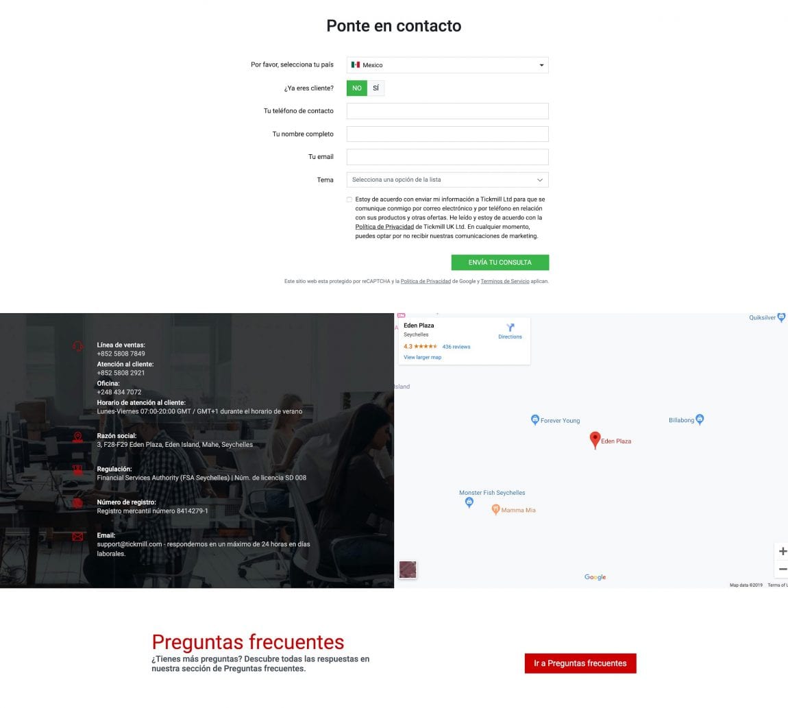 Tickmill ofrece varios canales de comunicación con sus clientes entre los que destacan el chat en vivo, el formulario de contacto de la web y la sección de preguntas frecuentes.