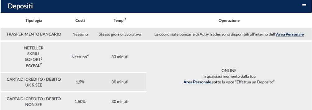 ActivTrades consente ai propri clienti di depositare gratuitamente con le seguenti modalità: