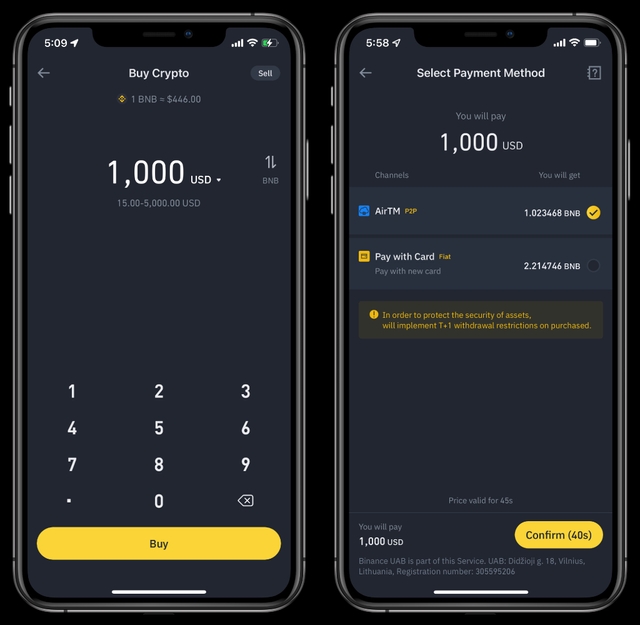 Anche gli utenti della app mobile Binance possono selezionare tra due tipologie diverse di piattaforma: la Lite e la Pro. La Lite è, di fatto, l’equivalente del portale di conversione presente sul sito Web di Binance Italia, in quanto consente semplicemente di comprare, vendere o convertire criptovalute. Accedendo alla app e selezionando Binance Lite, infatti, al cliente basterà digitare l’importo da convertire e selezionare un metodo di pagamento, come mostrato nell’esempio qui in basso.