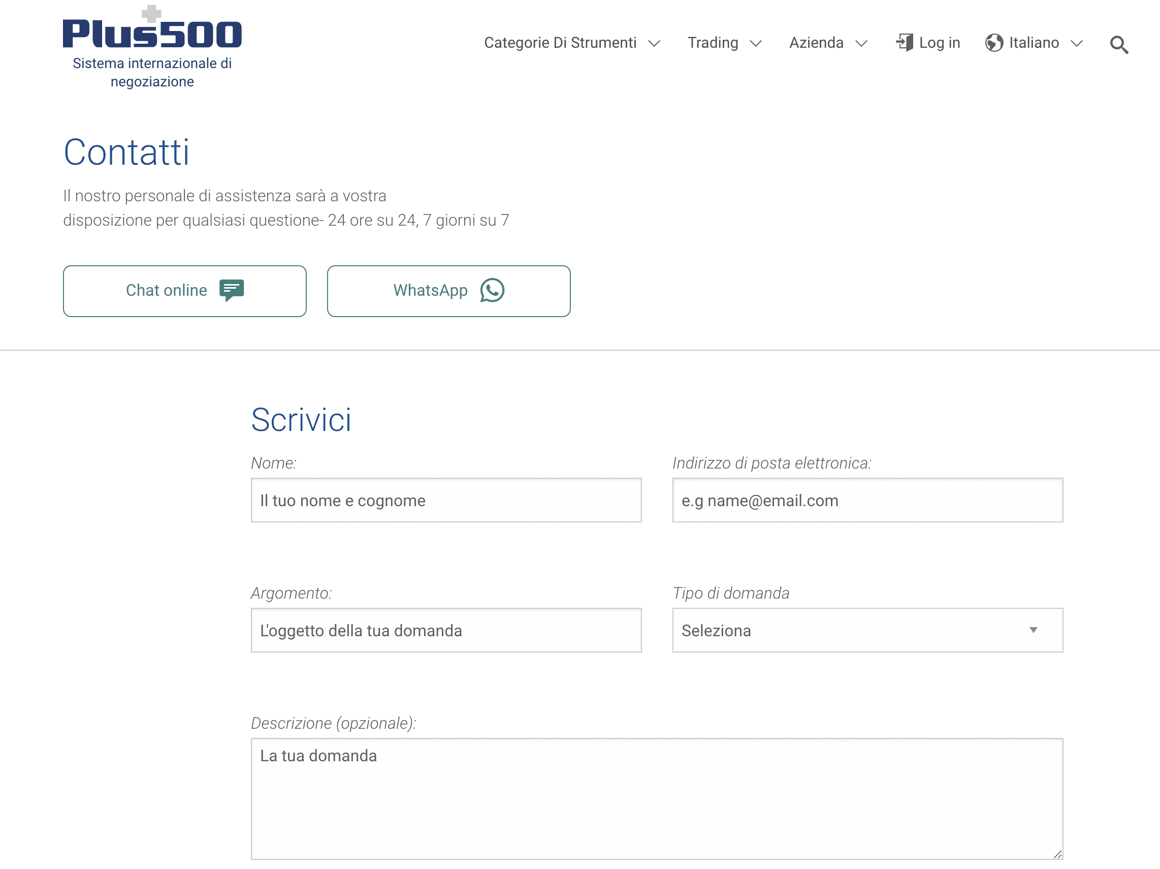 L’assistenza clienti di Plus500 è una delle migliori: infatti, è sempre raggiungibile 24 ore su 24 ore, 7 giorni su 7. Tra i metodi di contatti abbiamo Live Chat, sistema di ticket via email e anche WhatsApp.