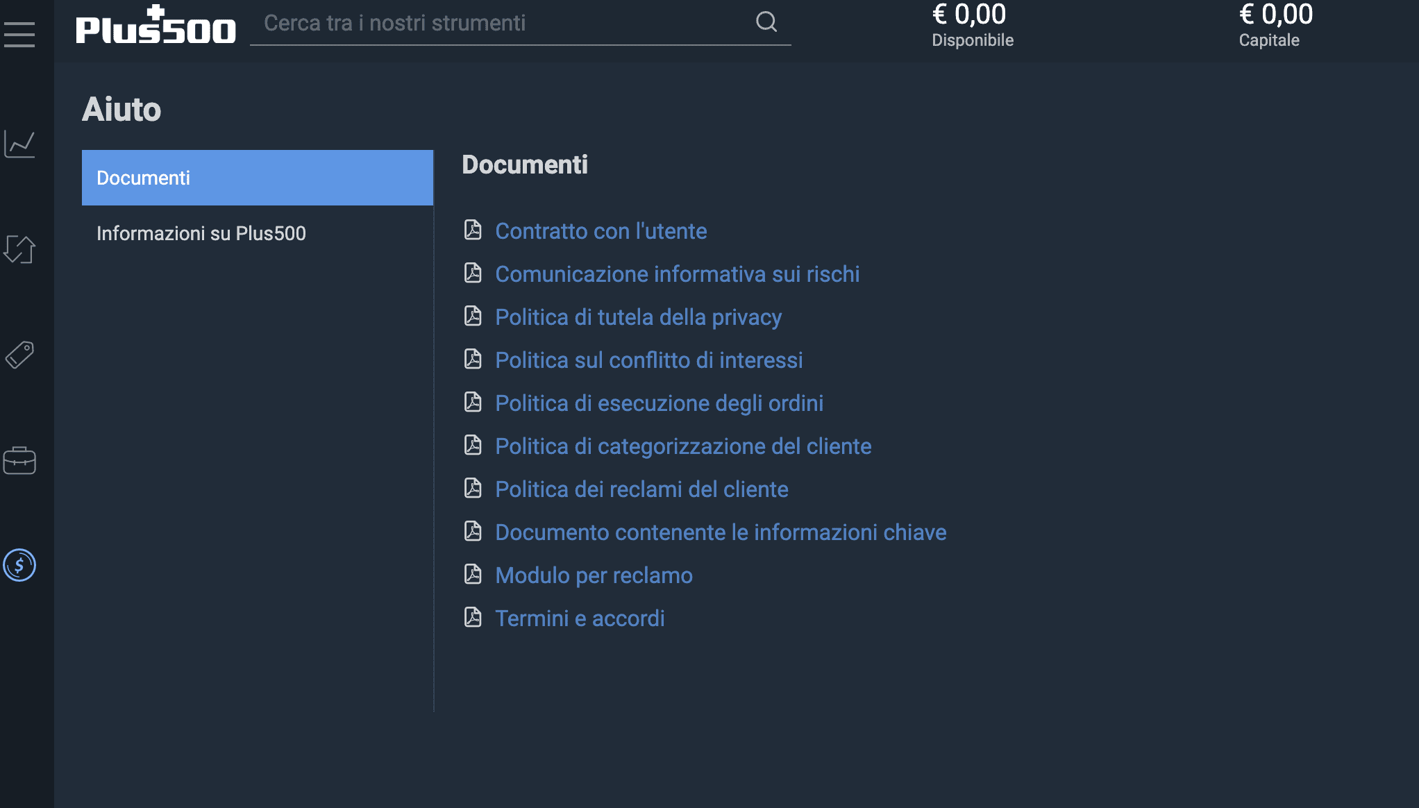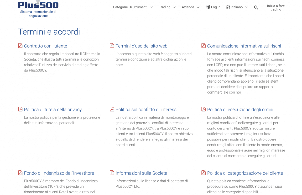 - Altrimenti, puoi sempre cliccare su “Termini e Accordi” per essere reindirizzato al sito di Plus500 contenente tutti i documenti PDF relativi ai Termini e Condizioni di Plus500