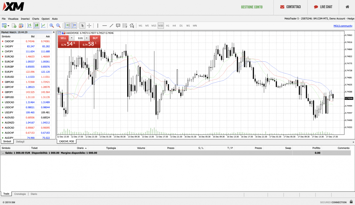 Però c’è da dire che il primo impatto potrebbe essere non proprio positivo. Per fortuna però è disponibile il conto demo XM: come ogni buon broker, anche XM offre conti demo gratuiti ai propri utenti. Il nostro consiglio è quello di aprire prima il conto demo, vedere da vicino come funziona la piattaforma (dotata di grafici, tanti strumenti dell’analisi tecnica, possibilità di ricevere segnali di trading) e poi decidere se passare al conto reale di XM.