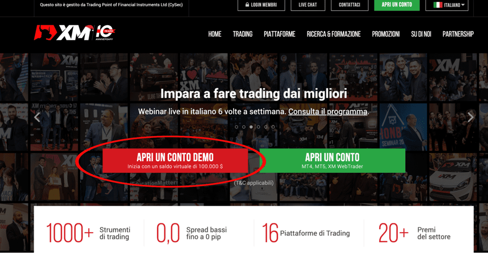 1) Appena accedi al sito del broker XM, ti ritrovi sulla homepage del sito del broker XM dove noterai subito un bottone rosso con scritto “Apri un conto demo”