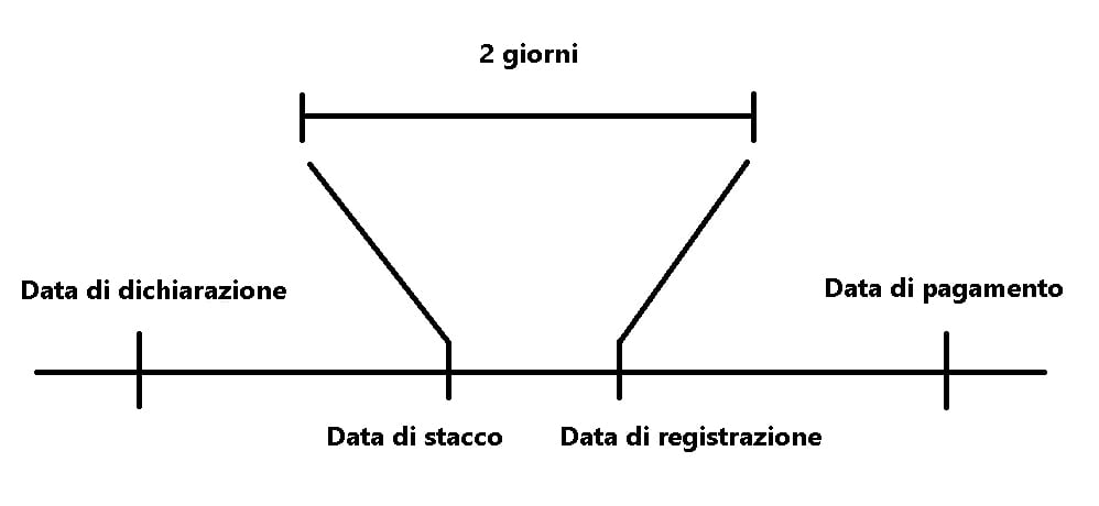 - Data di registrazione: La società registra i detentori delle azioni confermandone il diritto a ricevere il pagamento del dividendo. La data di registrazione è il primo giorno lavorativo dopo la data di stacco. Da un punto di vista di strategia di acquisizione del dividendo, non bisogna fare nulla in questo giorno.