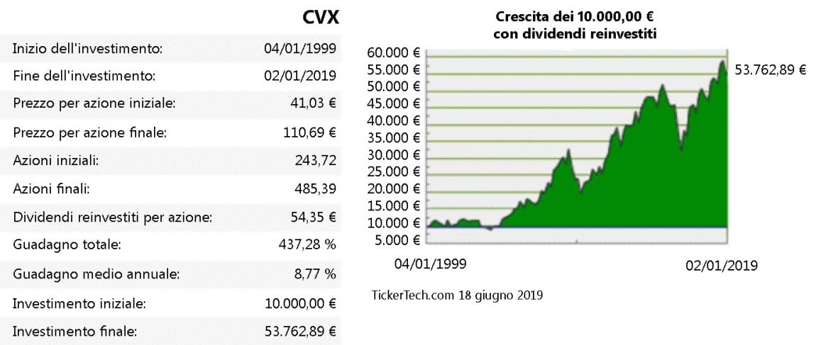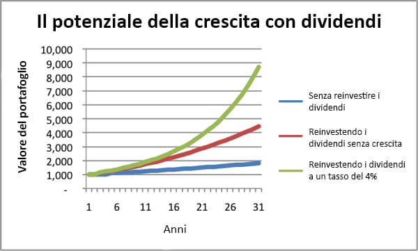 Senza il reinvestimento dei dividendi i ricavi totali della posizione sarebbero arrivati a circa 500.000 € a conclusione del periodo d'investimento. Ma se si guarda allo stesso investimento con il reinvestimento dei dividendi il guadagno cresce fino a 4 volte (poco sopra i 2 milioni).