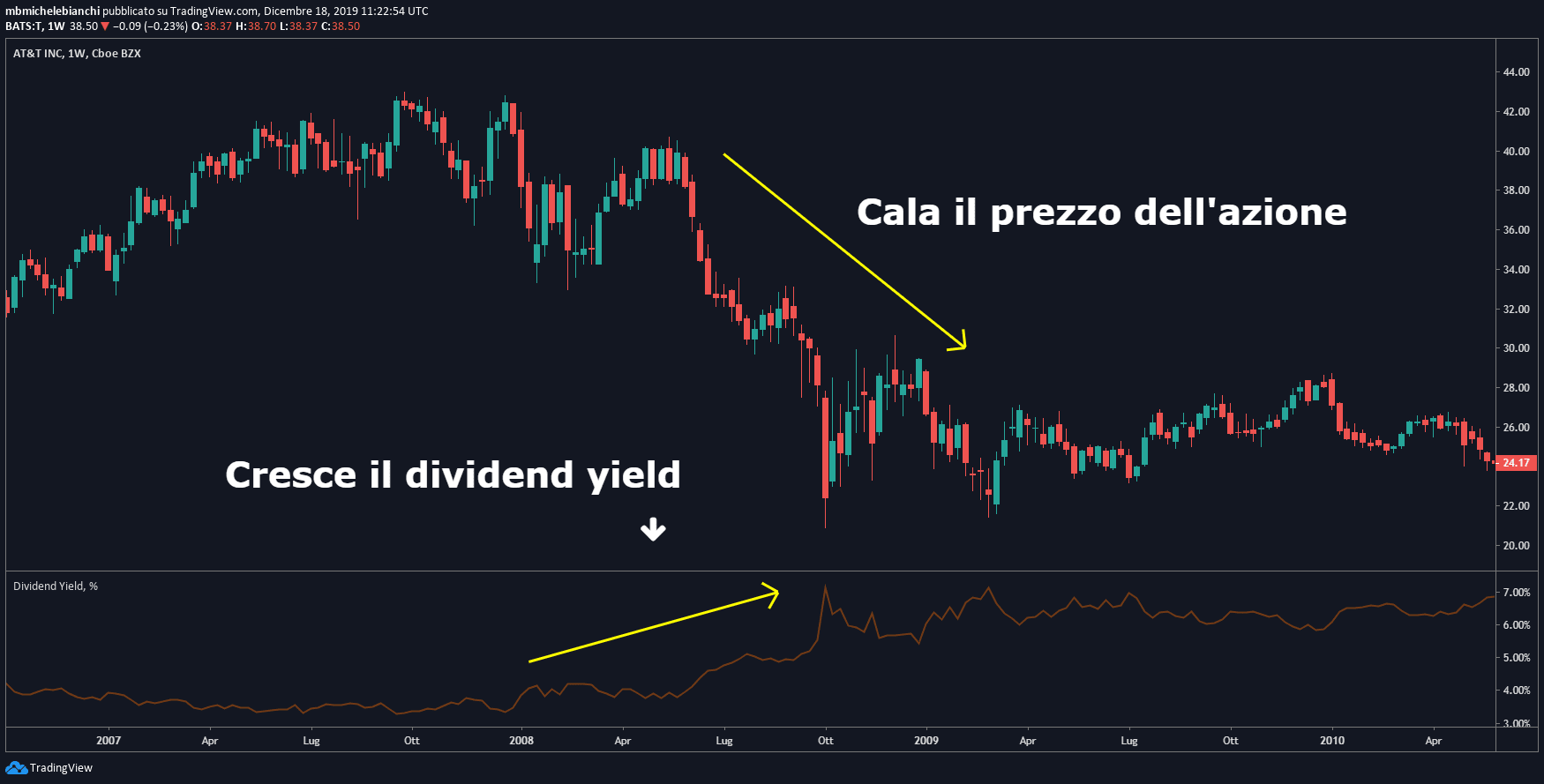 Questo significa che i dividendi non sono affatto sempre garantiti. Cambiamenti nell'economia globale e rischi specifici possono limitare la redditività delle strategie che prevedono di investire per dividendi. È molto importante anche tenere d'occhio le società con dividend yield insolitamente alti. Infatti un dividend yield cresce quando il prezzo dell'azione cala. Quindi un dividend yield estremamente alto potrebbe essere dovuto a un calo del valore dell'azione e quindi a problemi nella società (che in futuro potrebbe anche decidere di tagliare il dividendo).