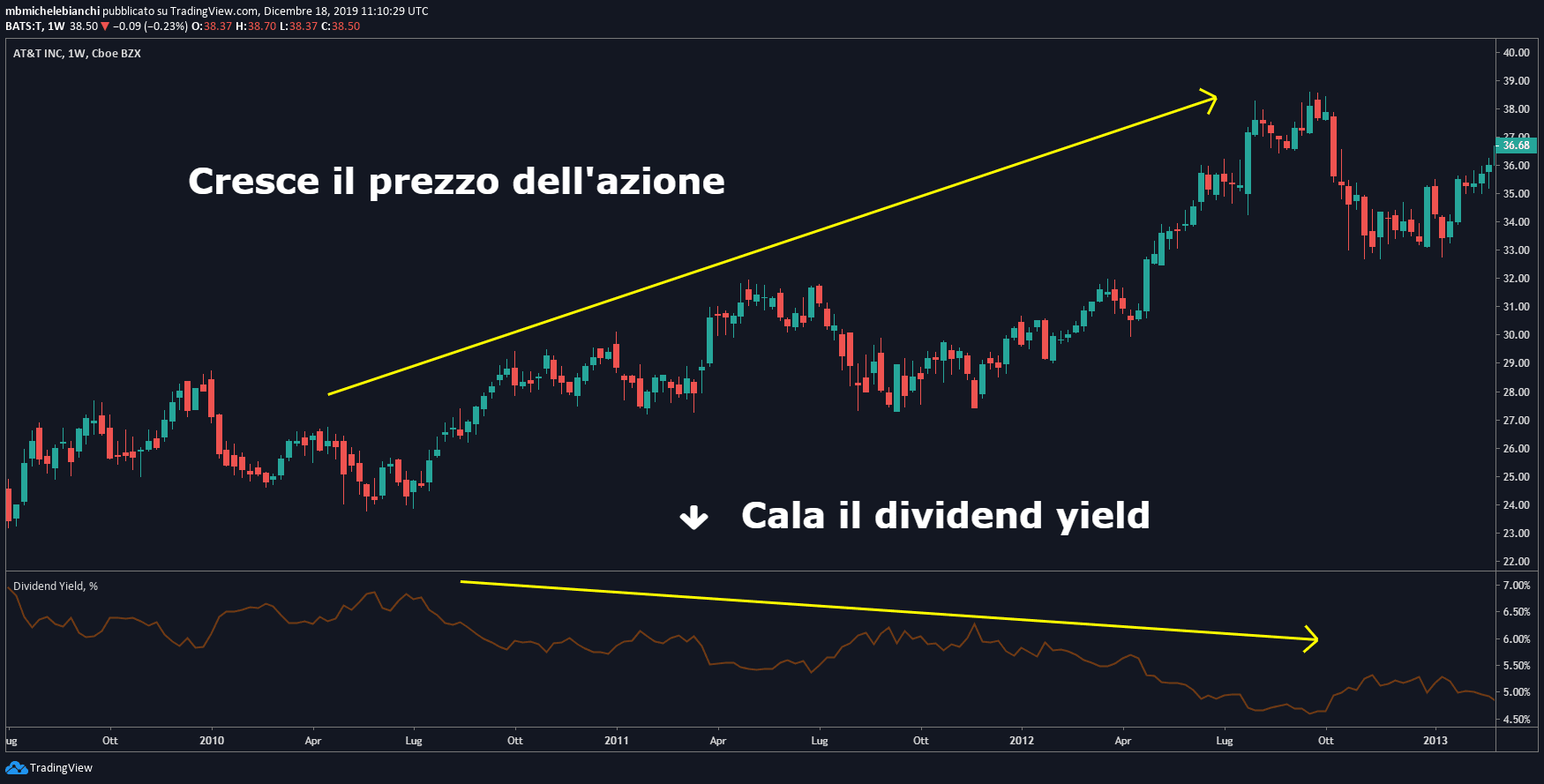Ora che sappiamo quando va comprata l'azione possiamo concentrarci sui benefici che ne derivano. Per capire il valore di un dividendo è necessario prima indagare come viene calcolato: parliamo di dividend yield. Il dividend yield non è altro che il rapporto tra il dividendo annuale dell'azione e il prezzo dell'azione stessa (in percentuale):