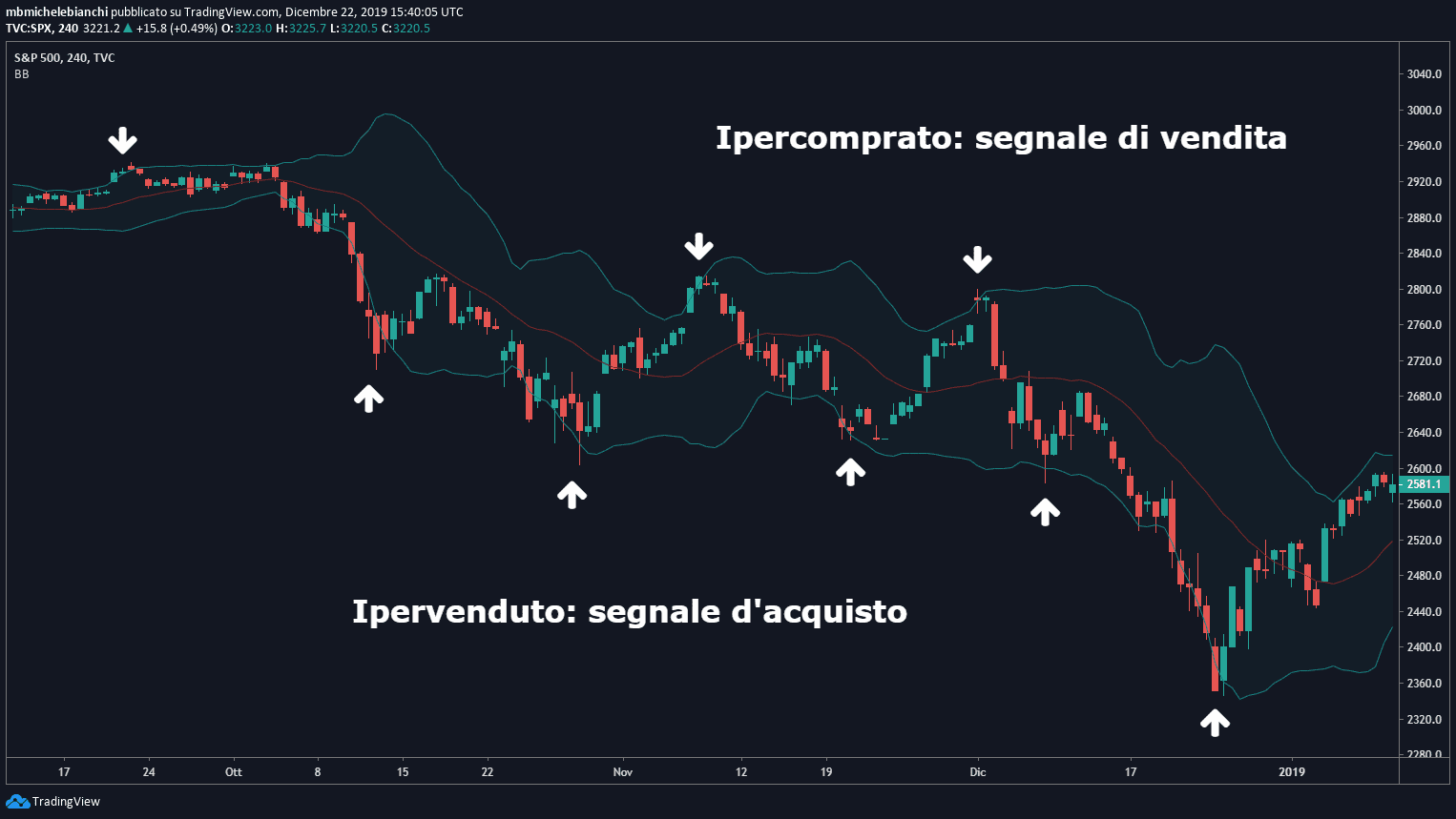 Le bande di Bollinger sono una tecnica di trading che ruota intorno alla media e alla deviazione dei prezzi da tale media. Quando i prezzi salgono sopra la media storica e superano la banda superiore, lo strumento è in ipercomprato. Viceversa, quando i prezzi scendono sotto la media storica e sfondano la banda inferiore, lo strumento è in ipervenduto.