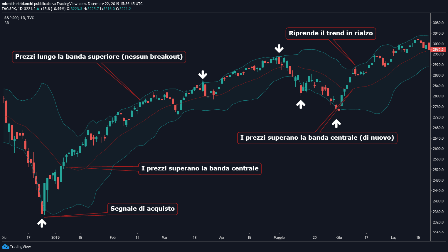 Un trader più aggressivo invece potrebbe decidere di mantenere la posizione aperta dato che i prezzi non sono scesi al di sotto della linea centrale delle bande di Bollinger dopo la rottura in rialzo. Infatti i prezzi si mantengono al di sopra della linea confermando l'aspettativa che il trend rialzista sia ancora in atto.