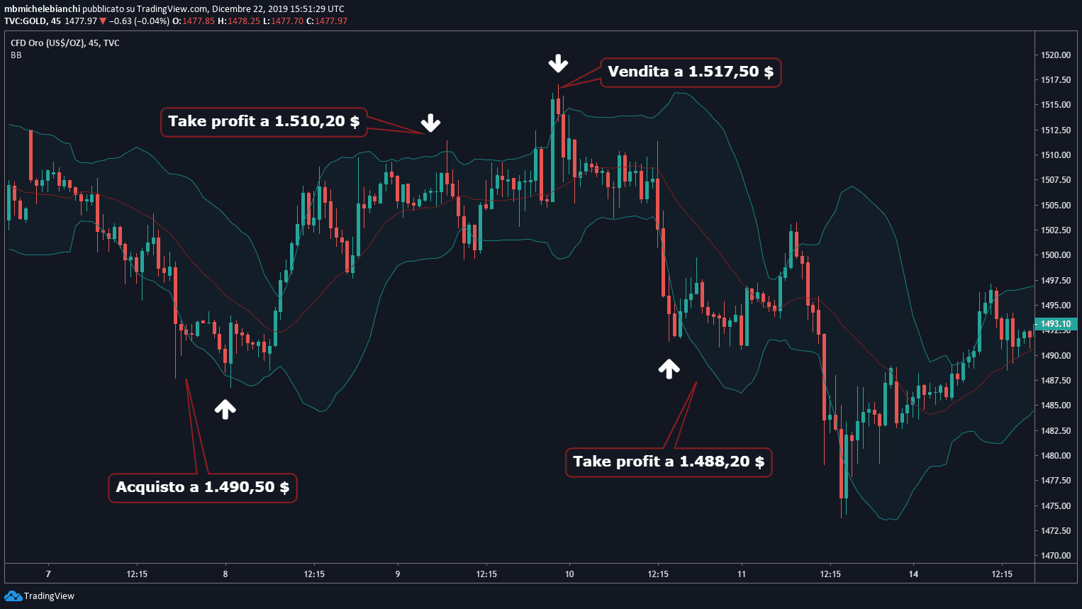 Le bande di Bollinger sono un ottimo strumento per fare trading sfruttando la volatilità insita nel mercato. Nell'esempio sottostante possiamo vedere che i prezzi sono scesi al di sotto delle bande di Bollinger. Si tratta di un segnale di acquisto quindi è bene comprare l'oro a 1.490,50 $ dato che i prezzi cresceranno.