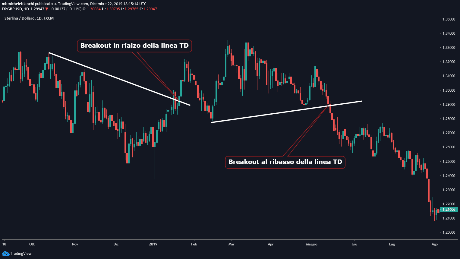 - Un breakout TD si verifica quando il prezzo dello strumento chiude sopra una linea di trend con pendenza negativa. Oppure quando il prezzo dello strumento chiude al di sotto di una linea di trend con pendenza positiva.