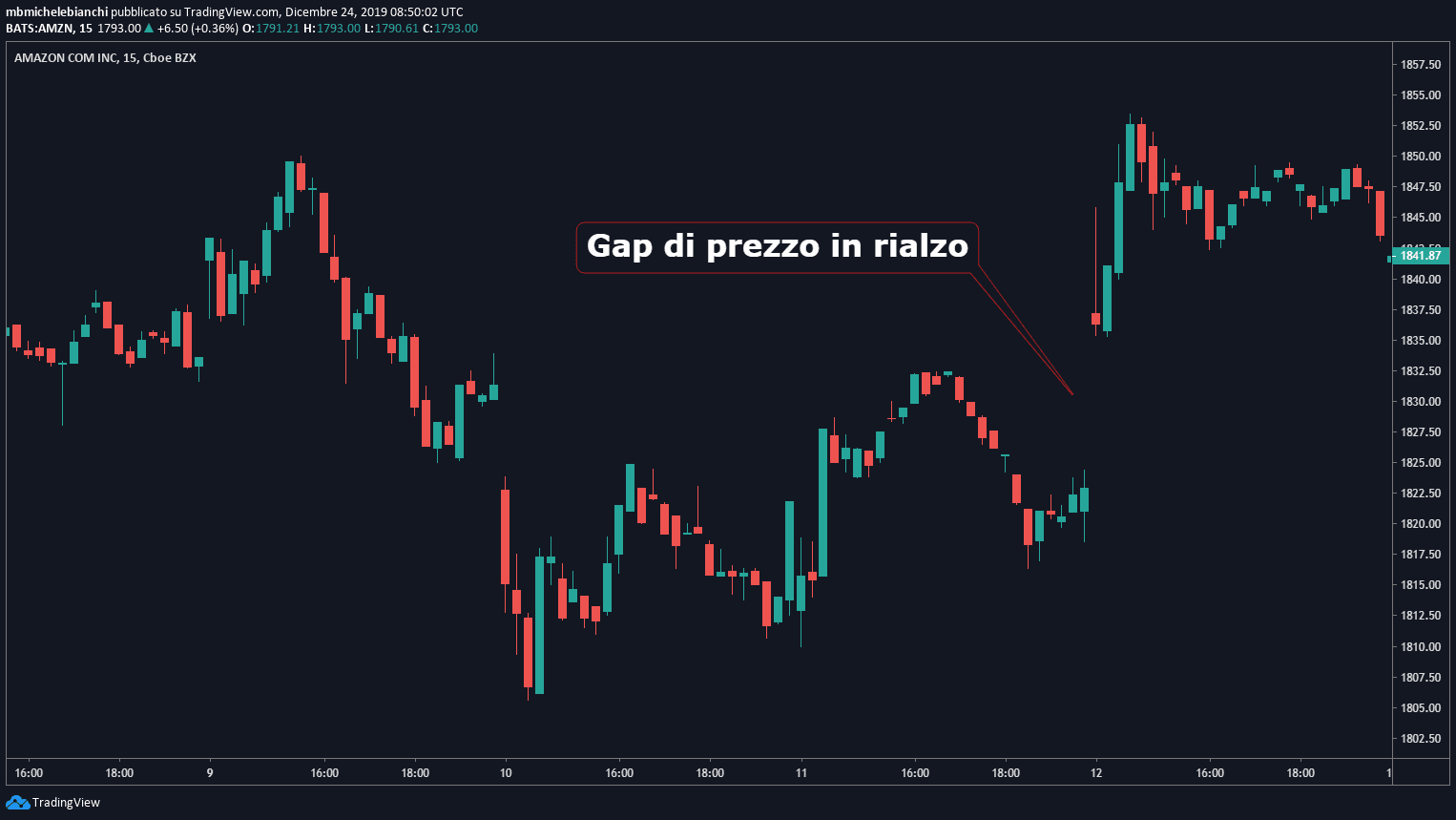 Di conseguenza, all'apertura del mercato, si verificherà un gap di prezzo verso l'alto, quando gli investitori avranno occasione di recuperare e reagire alle nuove informazioni disponibili. In sintesi il prezzo dell'azione all'apertura della sessione sarà a un valore più alto rispetto a quanto ha chiuso la sessione di mercato precedente (mostrando quindi un gap di prezzo sul grafico).