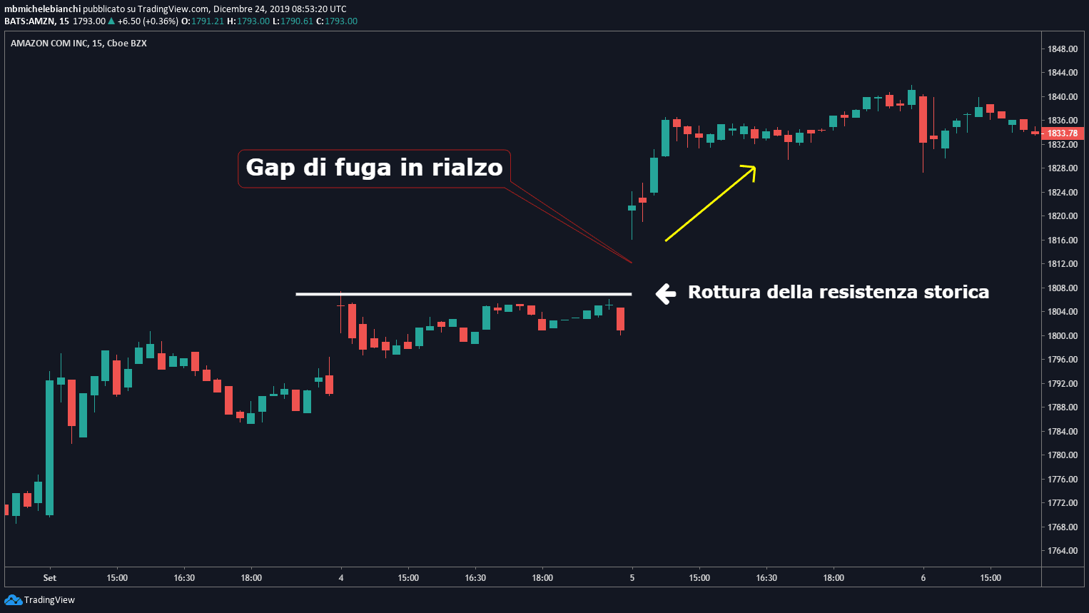 - Gap di fuga.(“Breakaway gap”) Si riconoscono quando il gap porta i prezzi al di sotto di un supporto o al di sopra di una resistenza. Normalmente sono il risultato di un sentimento di mercato sopra la media che segnala un cambiamento di tendenza. Quando il gap porta i prezzi sopra alla resistenza le aspettative sono in rialzo (ottime per comprare). Quando il gap porta i prezzi sotto il supporto le aspettative sono al ribasso (ottime per vendere).