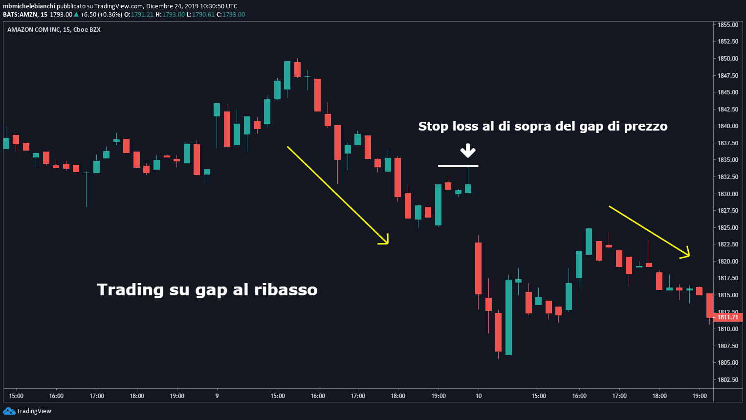 Si tratta di un gap di continuazione e implica che il trend al ribasso probabilmente continuerà. Un trader esperto venderà è fisserà uno stop loss appena sopra l'ultima resistenza sul grafico, cioè il prezzo appena prima del gap al ribasso (la linea bianca orizzontale).
