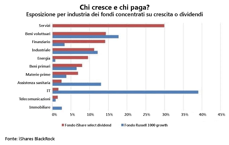 Le società obiettivo del growth investing tendono a essere giovani e piccole (con le azioni da poco disponibili sul mercato). Tuttavia, è possibile concentrarsi anche su qualsiasi azione dei mercati finanziari che abbia un grande potenziale in termini di apprezzamento del capitale. Il grafico sottostante confronta vari settori industriali in base alle prospettive di crescita o di distribuzione dei dividendi. Le industrie con più prospettive di crescita risultano tecnologie dell'informazione (IT), beni voluttuari e assistenza sanitaria.