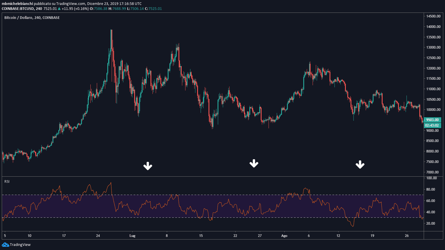 Nel prossimo esempio di divergenza con RSI, riprendiamo nuovamente il grafico dei bitcoin su dollaro statunitense a 4 ore e concentriamoci sul trend ribassista mostrato a sinistra. Tale trend non è confermato dall'indice di forza relativa che cresce mentre il prezzo continua a calare. Anche qui un trader potrebbe sostenere che il trend non è valido e decidere di aprire una posizione in acquisto in controtendenza.