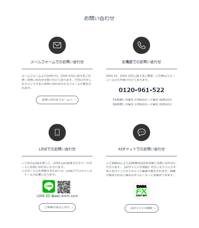 DMM FXでは簡単にお問合せが可能です。メールフォーム、お電話、LINE、AIチャットの4つの方法をご利用いただけます。