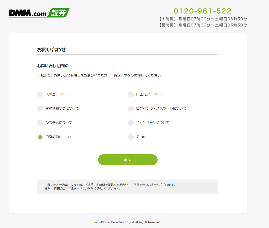 - フリーダイヤル(0120-961-522)の24時間サポートのお問い合わせは、月曜日の7時から土曜日の6時50分(夏時間5時50分)まで受付しているので、大手FX証券会社ながらの、信頼出来る便利なカスタマーサポートを利用することができます。