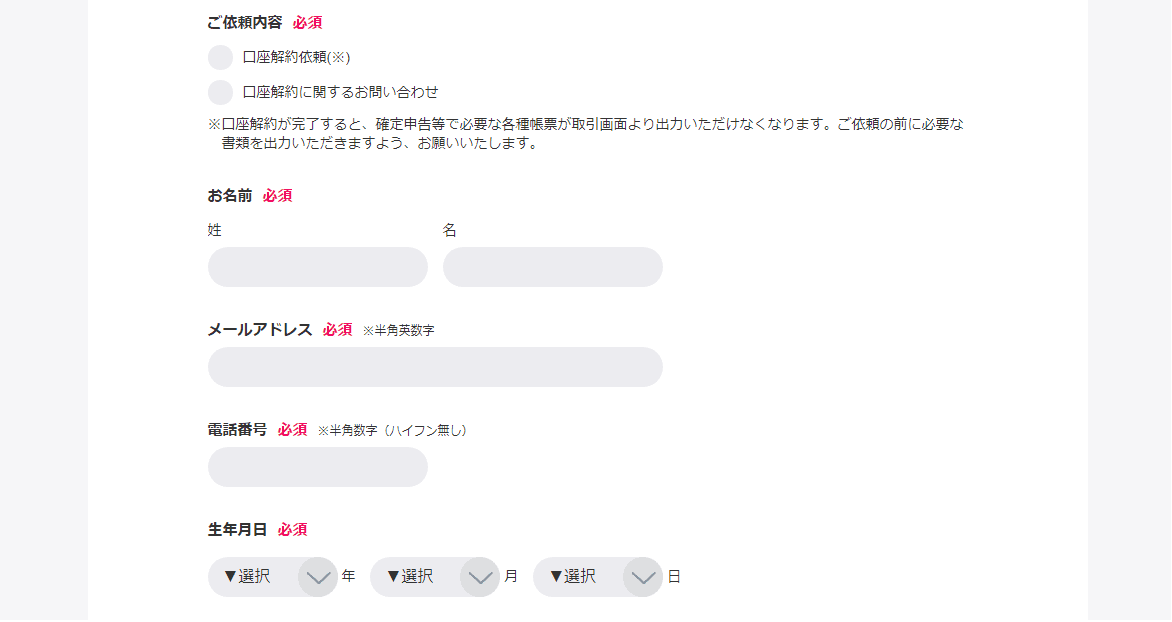 - ご依頼内容の「口座解約依頼」を選択し、名前、メールアドレス、電話番号、生年月日、ご住所、お客様番号、お問い合わせ内容を記入後、「送信」ボタンをクリックします。