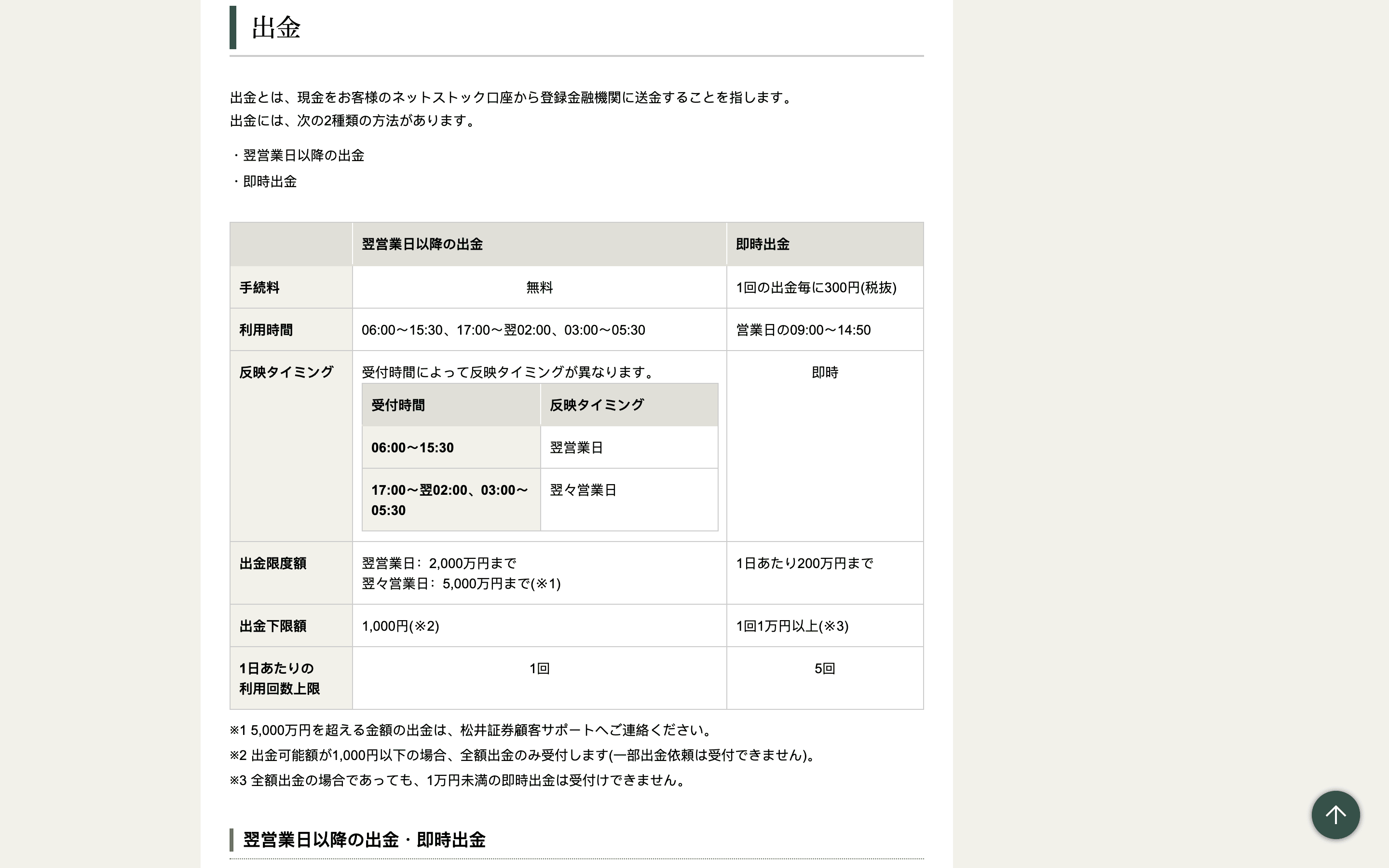 ただし、松井証券の口座の残高が1万円未満の場合は即時出金ができないこと、残高が1,000円以下の場合は全額出金のみ可能であることにご注意ください。