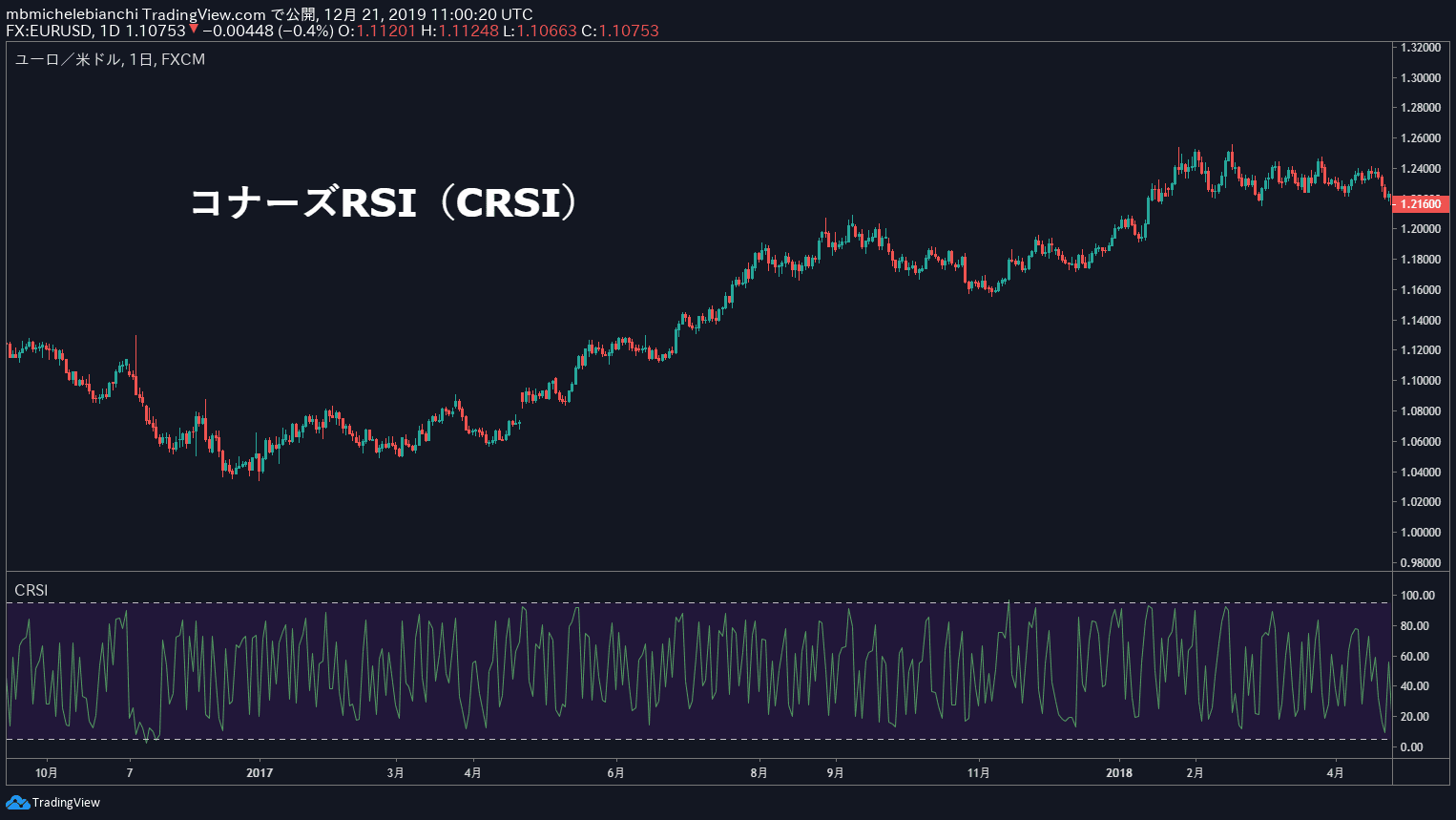 - コナーズRSI(CRSI)とは、3つの別々のインジケータの平均を活用したモメンタムオシレーターツールです。