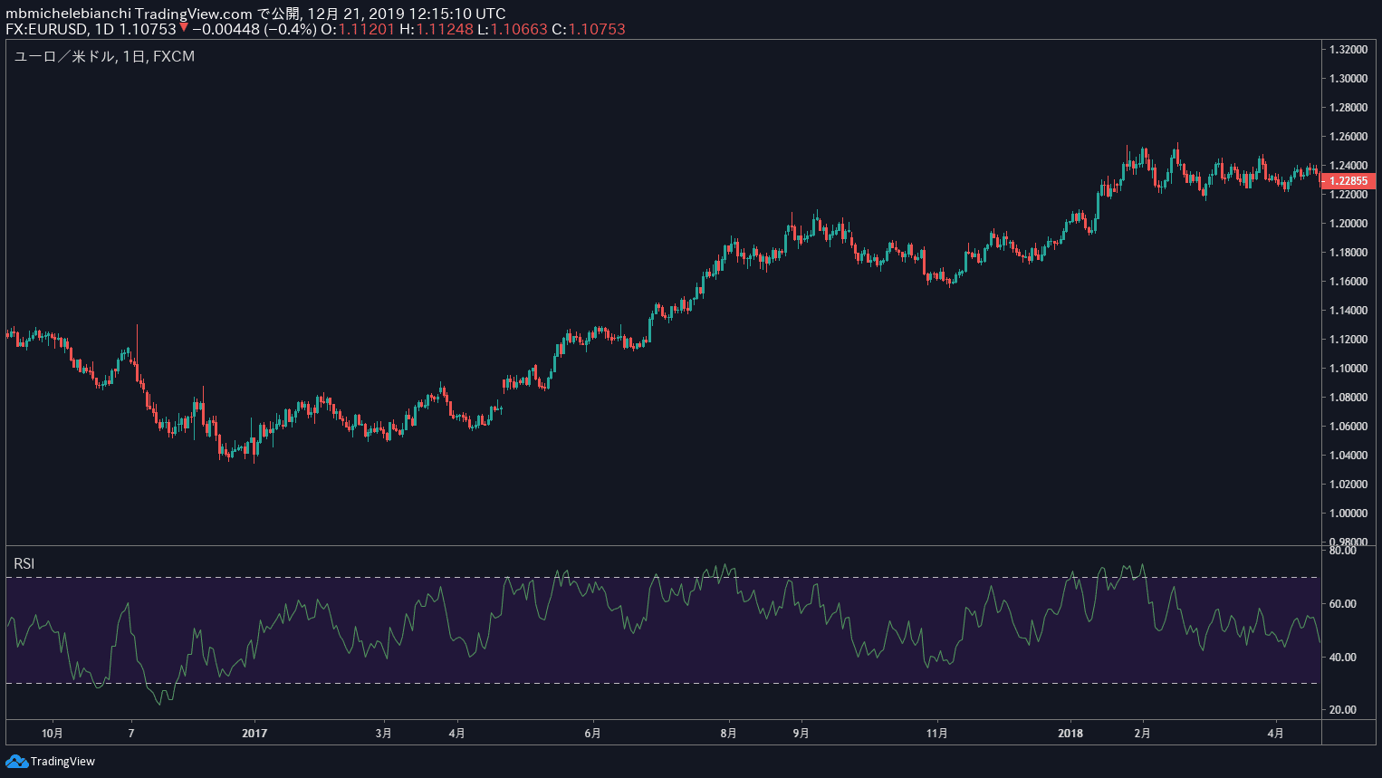 まず、コナーズRSI(上図)とJ.ウェルズワイルダーが1970年代に考案した従来のRSI(下図)を視覚的に比較すると分かりやすいでしょう。
