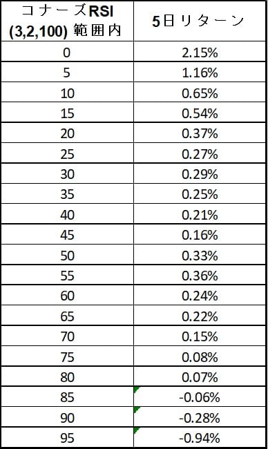 コナーズRSIの価値が20を下回ると、次の5日間の平均市場リターンが大幅に増加し始めることがわかります。0値に分類される株式(CRSI指標測定値が0~5)は、次の5つのトレーディングセッションで平均2.15%の価格上昇が見られます。