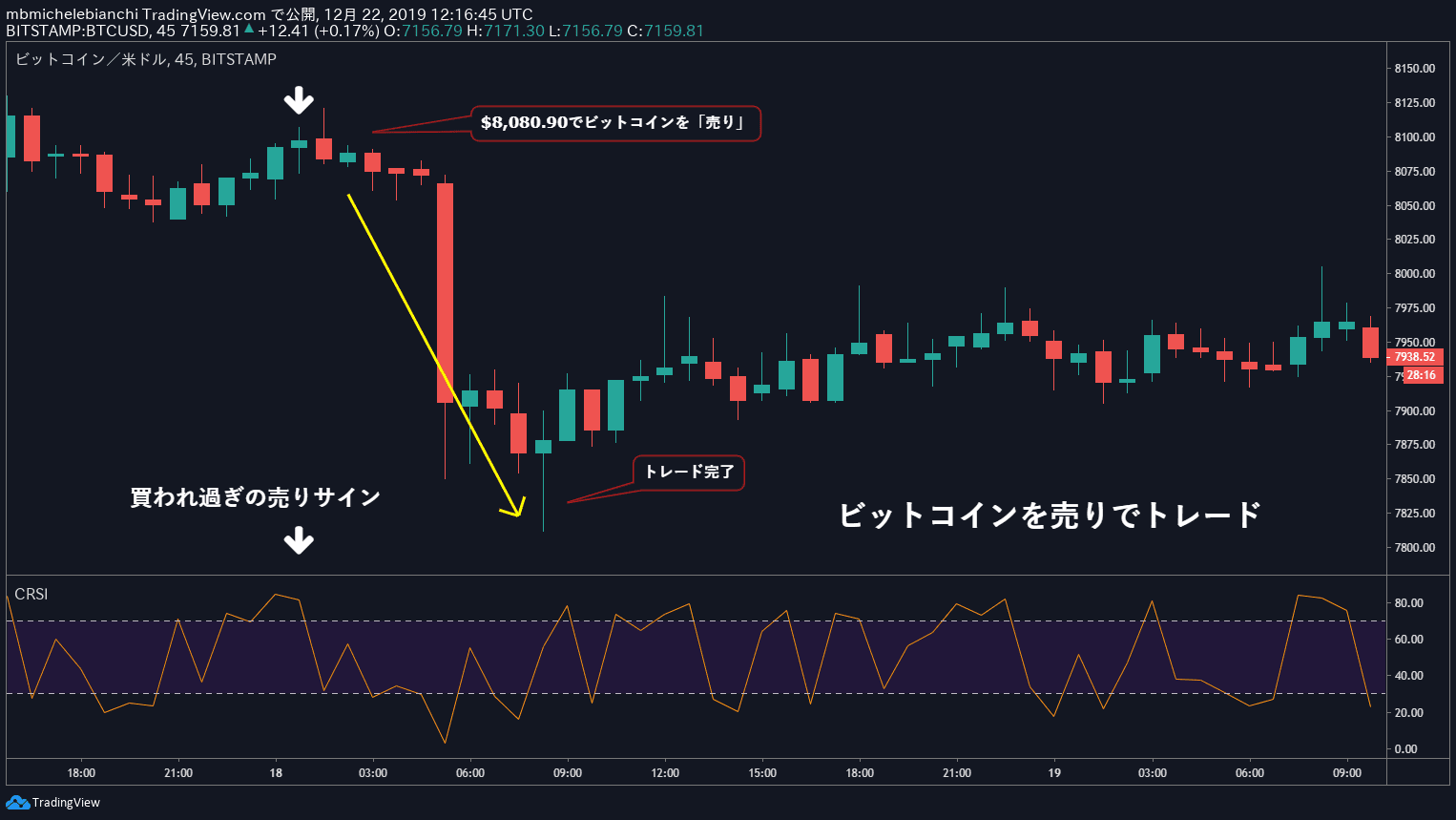 コナーズRSIはブルやベア市場の両方で取引機会を見つけるために利用できます。 最初の例では、チャートシグナルはビットコインを8,080.90ドルで売る機会を示しています。 コナーズRSIのテクニカル測定では買われ過ぎシグナルが出ており、価格が下落する見込みがあることを示唆しています。