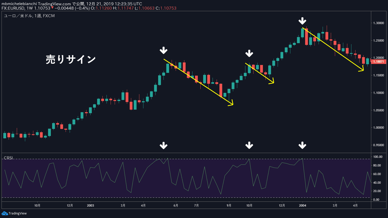 いずれの場合でも、資産は高値に達し、CRSIの予想通りに株価の下落が始まります。 一つ目と三つ目の例で下落のフォロースルーが著しくなっていることも確認できます。 逆に、二つ目の例では、フォロースルーは多少制限されています。