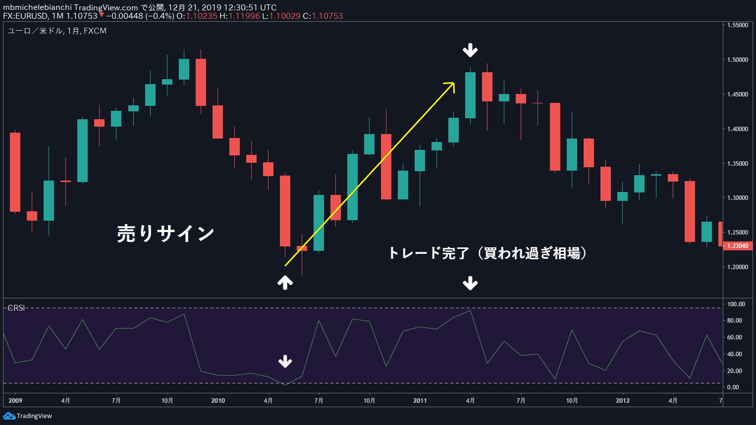 ここでは、株価が最終的にCRSIの予測通り(上向き)に推移していることが見て取れます。 トレーダーはすぐにストップロスを損益分岐点まで移動し、CRSIが次の取引シグナルを送信するまで取引を継続します。これは、評価がCRSIパラメーターの上限(95レベル以上)を突破したために発生し、トレーダーに買われ過ぎ状況を警告し、売りポジションをクローズする良い時期である(相場が反転の準備に入っているため)ことを示唆します。 この戦略を活用して、トレーダーはドローダウンをほとんど経験することなく、大幅な利益を獲得することができます。