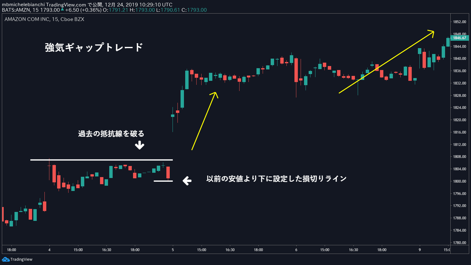 2番目のギャップトレードの例では、長期取引を確立するために使用できる強気のシナリオを見ることができます。このケースでは、横方向の取引幅で価格が抵抗線を上回った後に、強気のブレイクアウェイギャップが発生しました。買いの動きの重要性は、レンジ抵抗線を突破した後にはもっと大きなギャップを作るのに十分な強さで、これは追加の上昇フォロースルーの可能性を示しています。このようなシナリオでは、ストップロスラインは以前の幅の下限以下で設定され、トレードの利益が初期リスク条件に等しくなると損益分岐点に動きます。