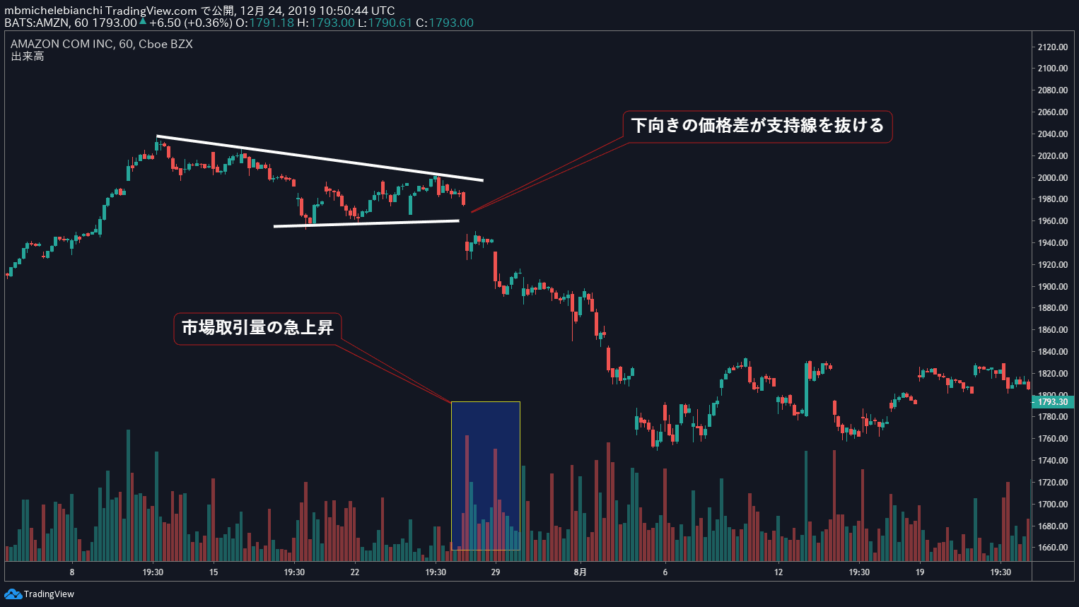 このような成り行きをランナウェイギャップとみなし、より広範な下落傾向が続く可能性が高いことを示しています。その結果、トレーダーは価格差(白い水平線で表示)に先行する最後の抵抗線の上にストップロスラインを設定してショートポジションを確立することができます。このような成り行きをランナウェイギャップとみなし、より広範な下落傾向が続く可能性が高いことを示しています。その結果、トレーダーは価格差(白い水平線で表示)に先行する最後の抵抗線の上にストップロスラインを設定してショートポジションを確立することができます。