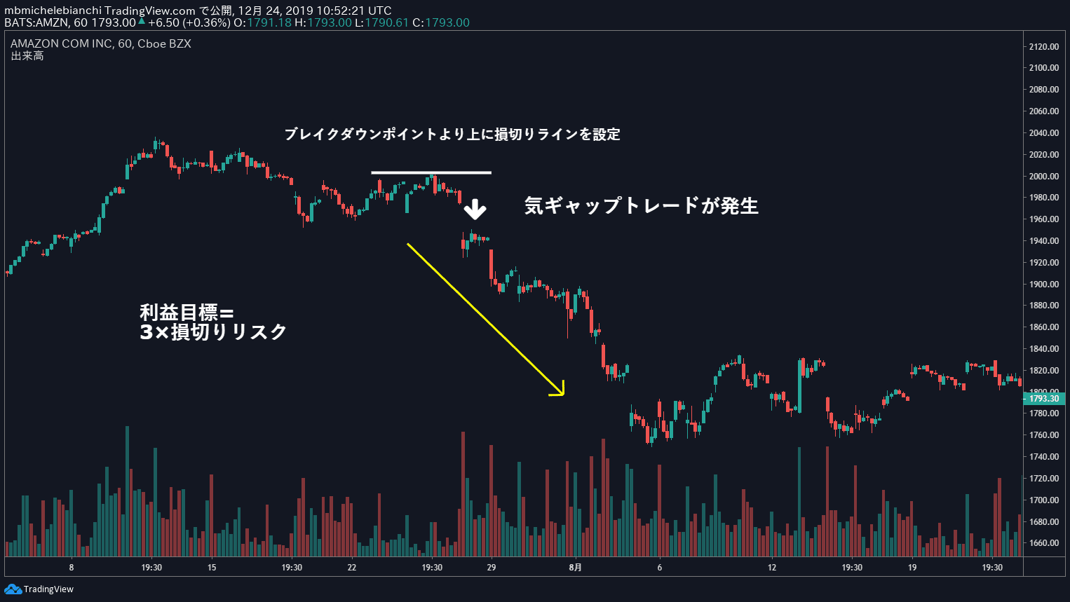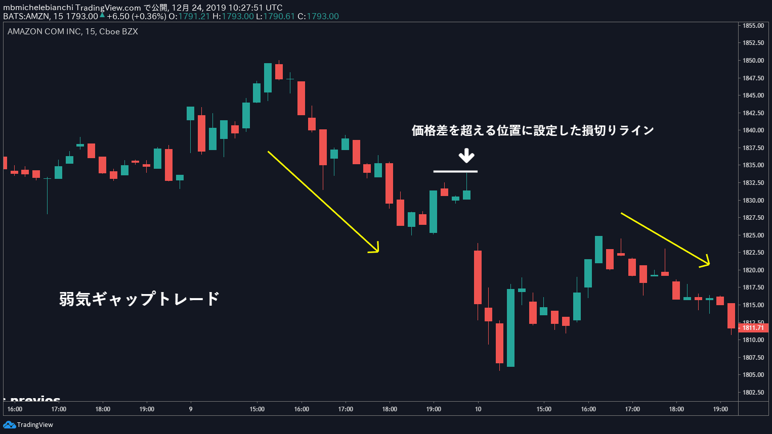 今や優勢な市場の方向性は明らかに弱気なので、ギャップトレーダーはショートポジションを始めることができます。トレードエントリーポイントは白い下向き矢印にあることが分かりますが、保護的なストップロスラインは、最初の価格差の原因となったブレイクダウンポイント(白い水平線)の上に設定する必要があります。