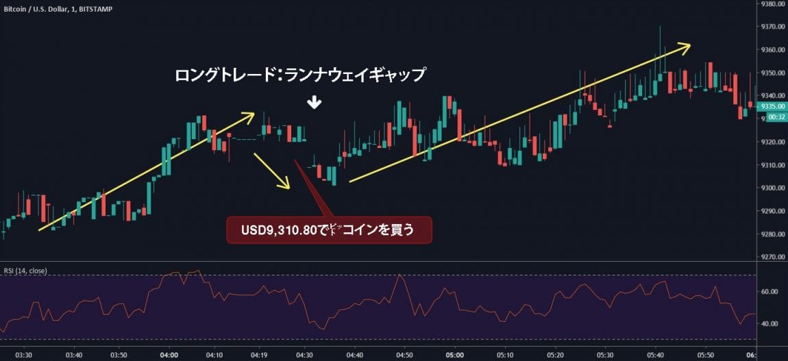 次のリアルタイム取引の例では、強気のランナウェイギャップがビットコインの買いシグナルを示しています。指標の測定値は中立水準であるため、これは以前の強気の上昇トレンドが依然として適切であることを示しています。その結果、ビットコインの価格は上昇し、ロングポジションの利益を生み出す可能性が高くなります。