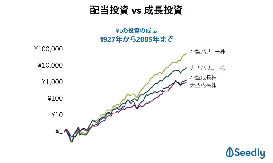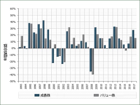 それらの特徴から、成長株投資家は短期や長期の値上がり益を通じて資産構築を目指していることが分かります。バリュー投資と比較した場合、成長投資戦略に見られる収益は、過去25年間でなかなか見事な収益を示しています。